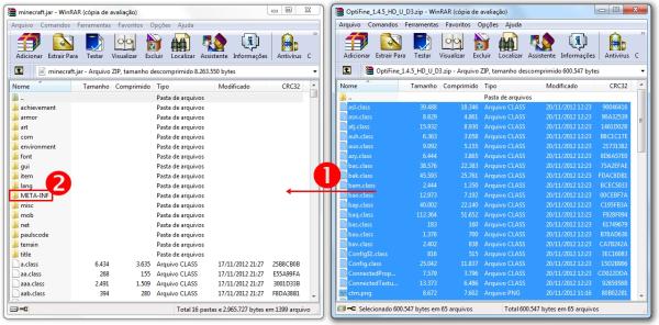 Instalar um mod que não precisa de outras plataformas previamente instaladas no Minecraft é uma tarefa consideravelmente fácil. Simplesmente abra o arquivo da modificação, copie todos os itens da lista e arraste-os para dentro da pasta do “Minecraft.jar” (1).