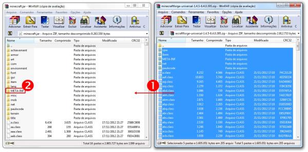 Caso o WinRAR exiba uma janela com opções de compressão, apenas pressione “Ok”. Então, delete a pasta “META-INF” (2) para que seu Minecraft esteja pronto para receber as modificações.