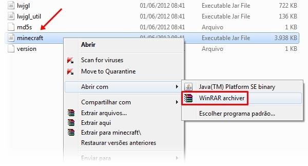 Feita a cópia, o próximo passo a ser seguido é acessar o .minecraft > bin e encontrar o item “Minecraft.jar”. Clique nele com o botão direito e, no menu de contexto, escolha Abrir com > WinRAR archiver como mostrado na imagem acima. Isso faz com que uma janela contendo todos os arquivos do programa seja aberta.