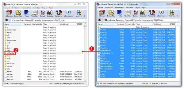 Se seu mod precisar da instalação prévia do ModLoader para funcionar, abra o software (não importa se ele está descompactado ou não) e copie todos os seus arquivos para a pasta do “Minecraft.jar” (1).