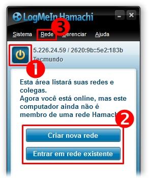 Se esta for a primeira vez que o Hamachi está sendo utilizado em sua máquina, ele vai oferecer duas opções na janela inicial (2); do contrário, essas mesmas ferramentas estão disponíveis clicando em “Rede” (3).