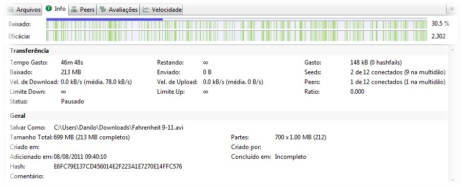 Já em "Info", são mostrados dados gerais como o tempo gasto, o restante e quanto foi baixado, além das velocidades de download e do upload.