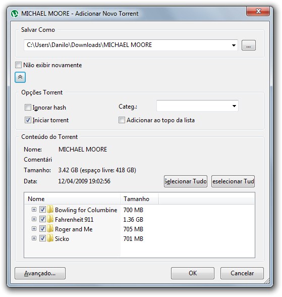 Em seguida, basta escolher o local em que o conteúdo será salvo. Nessa mesma janela você também verá todos os arquivos que estão incluídos no torrent. Assim, é possível marcar e desmarcar o que você quer e o que não quer baixar do “pacote”. Depois disso, é só clicar em "Ok".