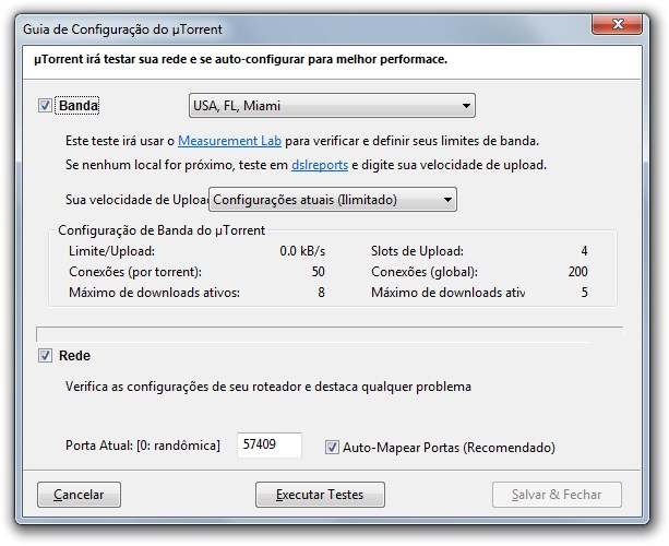 O teste de rede serve para os usuários que utilizam roteador. Ele verifica as configurações e destaca qualquer problema. Aqui é possível definir uma porta específica para o µTorrent ou então determinar que o cliente utilize uma aleatória.
