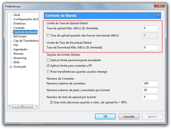 Já com a configuração "Controle de Banda", você pode limitar as taxas de upload e de download. Essa boa distribuição é fundamental para não sacrificar sua conexão e direcioná-la com melhor eficiência para baixar e enviar arquivos.