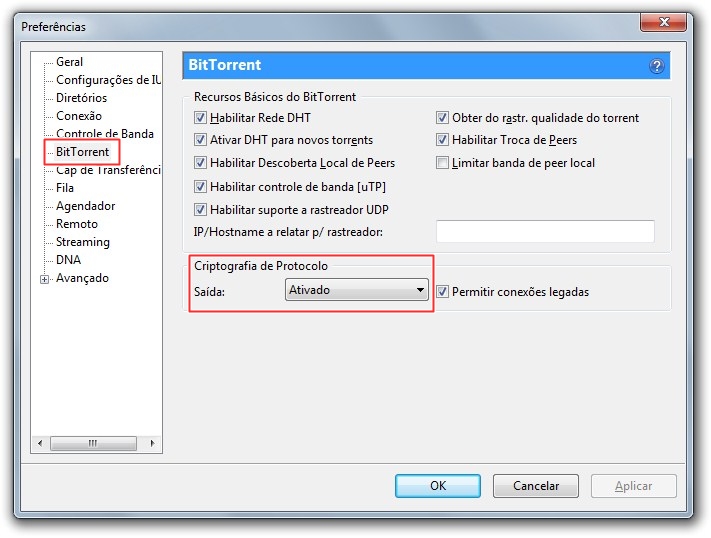 Para habilitar a Criptografia de Protocolo, vá em “BitTorrent”. No menu ao lado de “Saída”, selecione a opção “Ativado”.