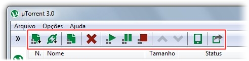 Você pode controlar todos os downloads que forem adicionados no µTorrent através dos botões no topo da tela. Assim, é possível pausar, começar ou parar um download, por exemplo.