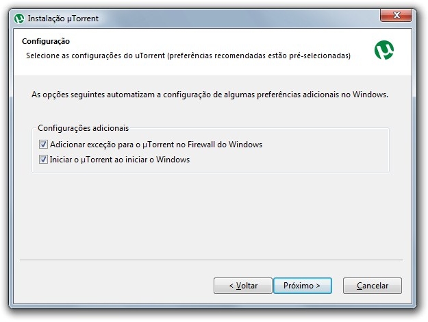 Na tela "Configuração", pode-se adicionar uma exceção para o µTorrent no Firewall do Windows e também fazer com que o cliente seja inicializado juntamente com o sistema operacional. Marque as opções que deseja.