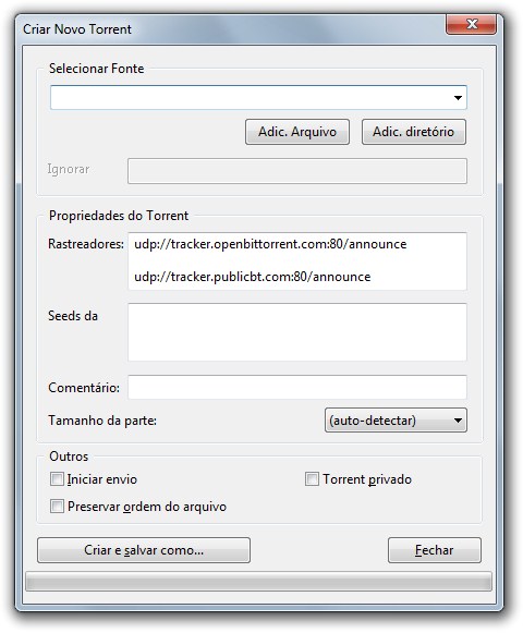 Você também pode compartilhar arquivos seus com todo o mundo, como fotos e vídeos que fez de um show, por exemplo. A fim criar um novo torrent, clique em Arquivo > Criar Novo Torrent. A janela de configurações é bem simples, e nela você define se vai adicionar um diretório todo cheio de arquivos (em "Adic. diretório") ou se vai apenas colocar um único arquivo (em "Adic. Arquivo").